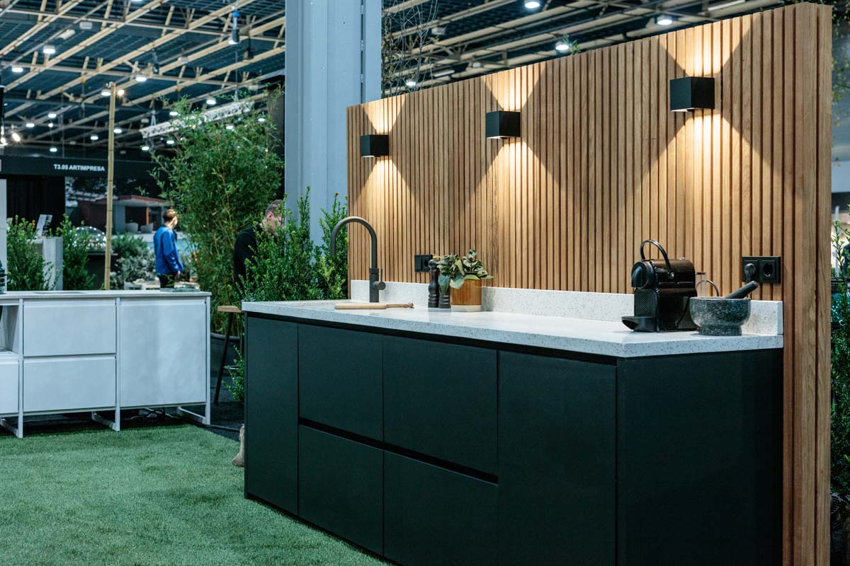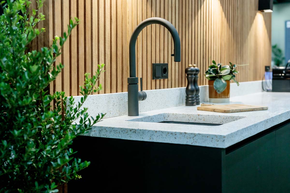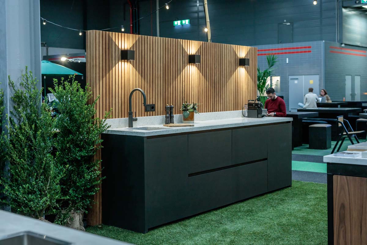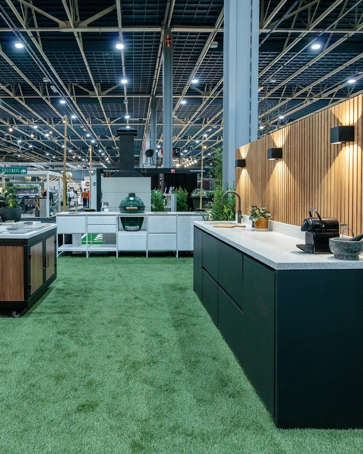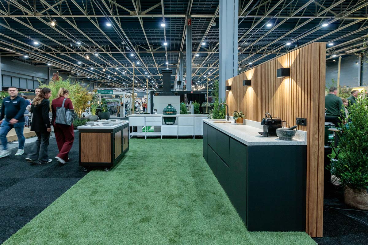 Voor Pronck had deze editie een extra bijzondere lading, omdat we voor het eerst met een volledig eigen stand aanwezig waren. Na jaren in gedeelde stands konden we eindelijk onze buitenkeukens in volle glorie presenteren. De hele collectie buitenkeukens stond er — van moderne minimalistische keukens tot stoere industriële ontwerpen, van toegankelijke startersmodellen tot luxe maatwerkstukken die precies aansluiten op iemands droomtuin. Het was prachtig om te zien hoe bezoekers enthousiast raakten bij het ontdekken van een kleurrijke uitvoering of een klassieke variant in natuursteen.