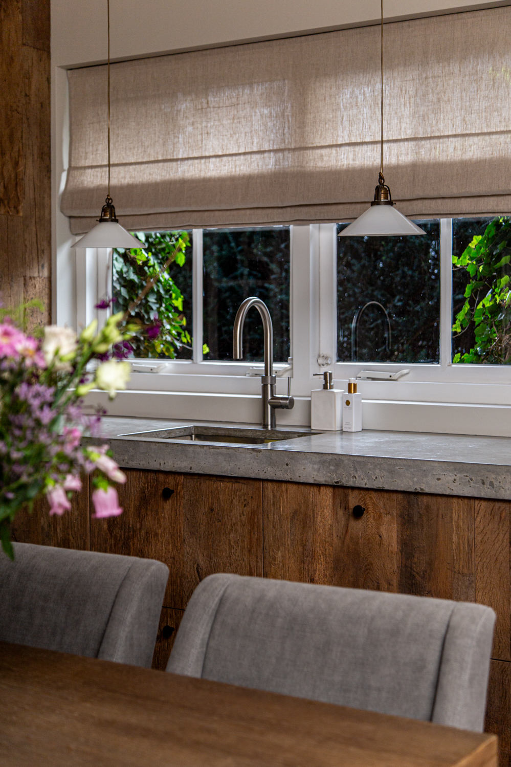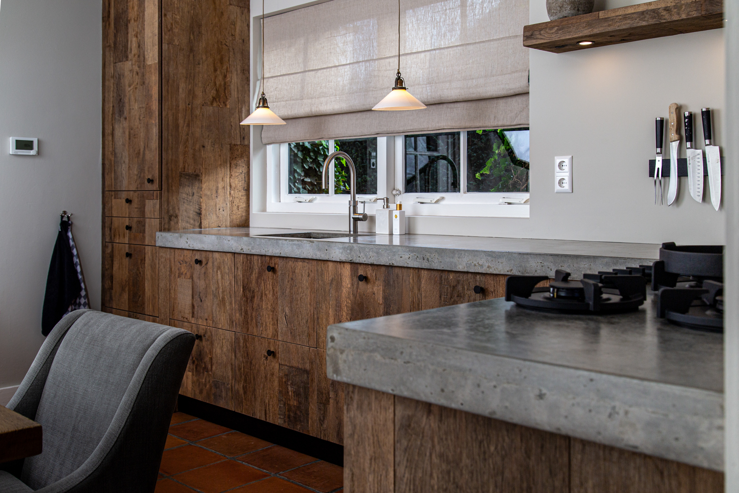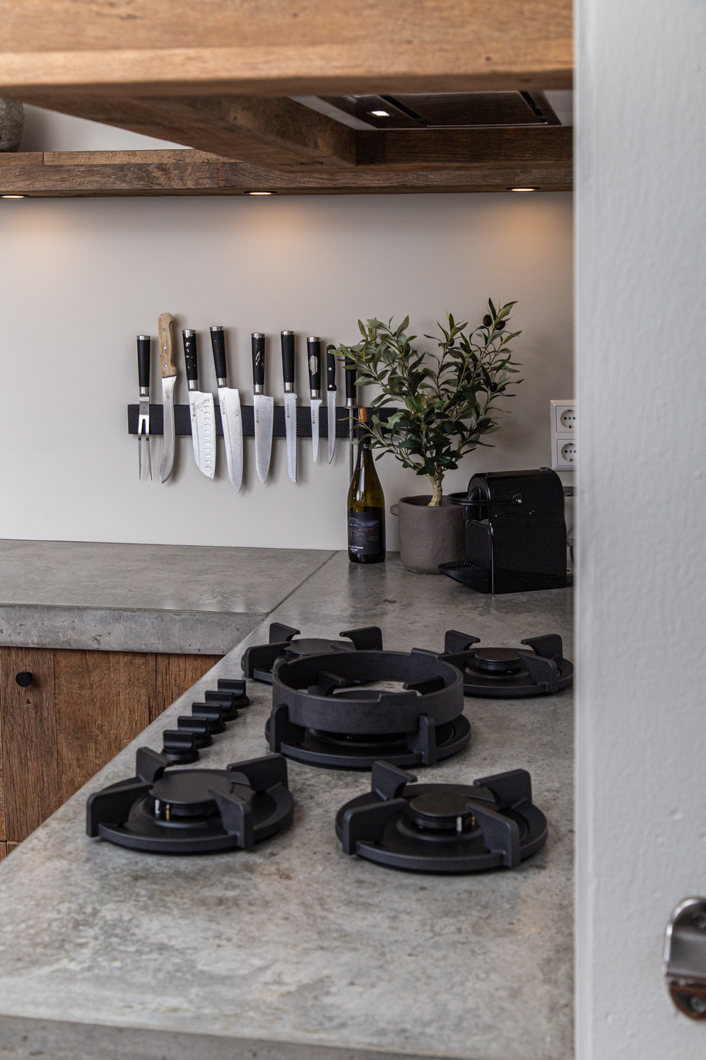 In deze warme industriële keuken draait alles om tactiliteit en technische precisie. Het 8 cm dikke betonnen aanrechtblad vormt een robuuste, sculpturale basis die de ruimte meteen karakter geeft. De RVS spoelbak en de Quooker sluiten hier naadloos op aan: praktisch, strak en perfect in balans met de industriële vormentaal. Koken gebeurt direct in het werkblad dankzij PITT cooking—een minimalistische integratie die maximale werkruimte behoudt en het zicht rustig houdt. Pronck leverde en realiseerde het complete werkgedeelte: het betonnen blad, de RVS spoelbak, de Quooker en de PITT cooking opstelling. Het resultaat is een keuken die warm aanvoelt, stoer oogt en elke dag topprestaties levert.