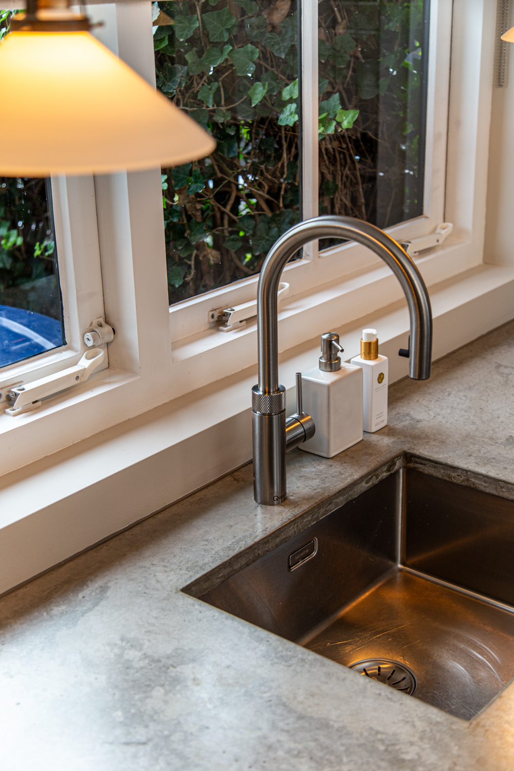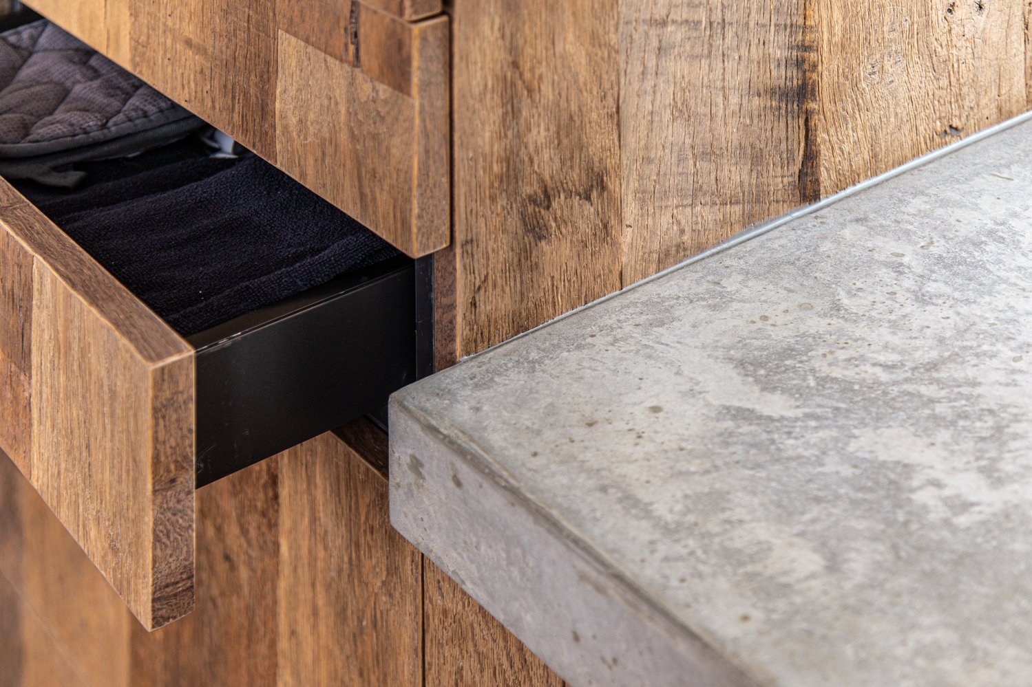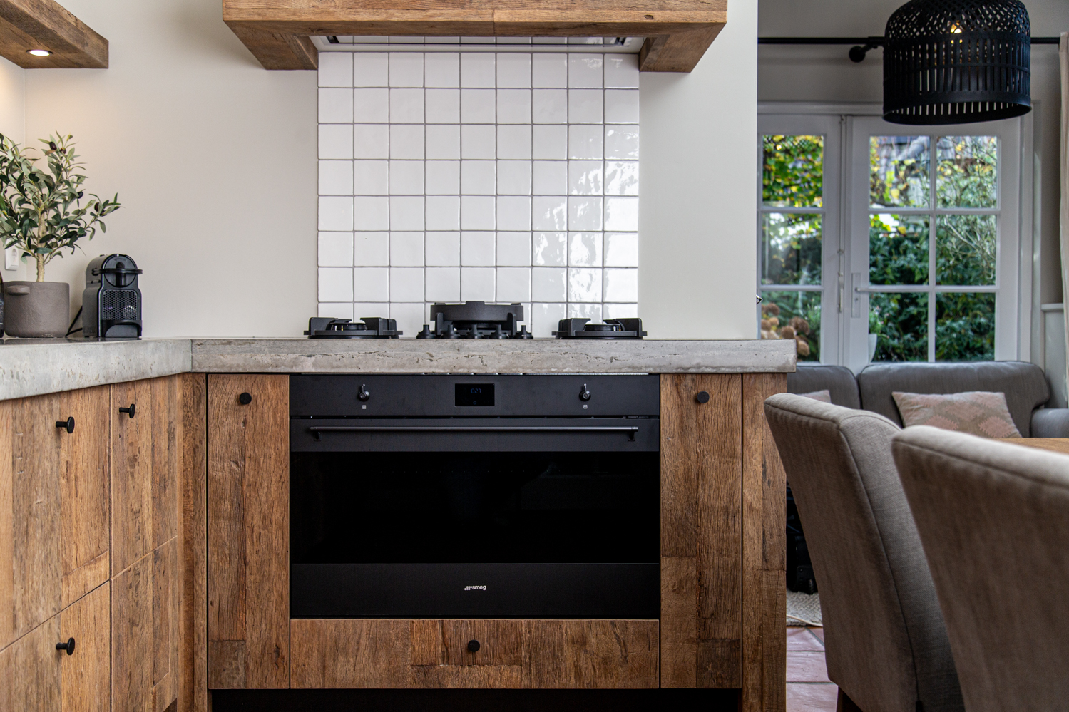In deze warme industriële keuken draait alles om tactiliteit en technische precisie. Het 8 cm dikke betonnen aanrechtblad vormt een robuuste, sculpturale basis die de ruimte meteen karakter geeft. De RVS spoelbak en de Quooker sluiten hier naadloos op aan: praktisch, strak en perfect in balans met de industriële vormentaal. Koken gebeurt direct in het werkblad dankzij PITT cooking—een minimalistische integratie die maximale werkruimte behoudt en het zicht rustig houdt. Pronck leverde en realiseerde het complete werkgedeelte: het betonnen blad, de RVS spoelbak, de Quooker en de PITT cooking opstelling. Het resultaat is een keuken die warm aanvoelt, stoer oogt en elke dag topprestaties levert.